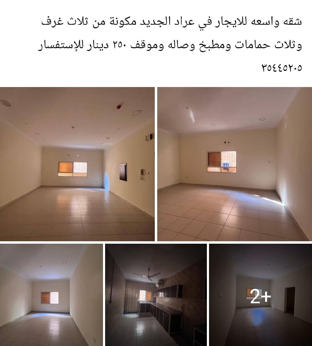 A spacious apartment for rent in New Arad, consisting of three bedrooms, three bathrooms, a kitchen, a living room, and a parking space for 250 dinars.