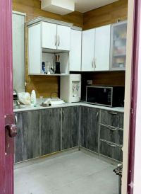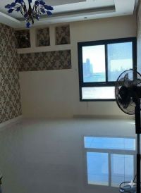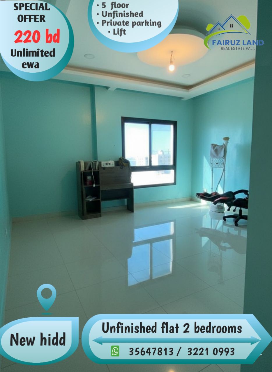The location is Al-Hadd Al-Jadeed. A clean apartment for rent with two rooms, including electricity and water, for 220 dinars. 2 bedrooms - 2 bathrooms - living room - kitchen - private parking - fifth floor with elevator - close to all services.