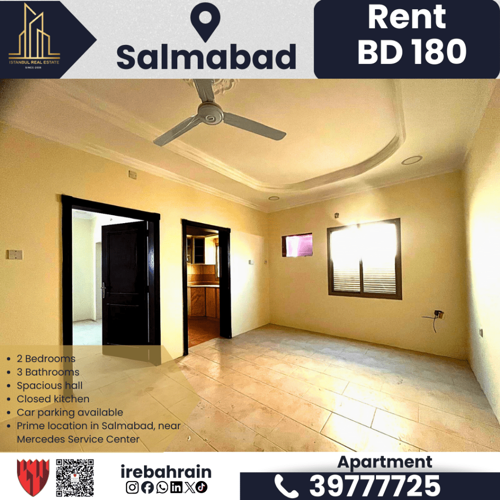 A two-bedroom apartment with a living room for rent in Salmabad. Rent is 180 Bahraini Dinars per month. It has 2 bedrooms, 3 bathrooms, a spacious living room, a closed kitchen, and a parking space is available. The location is excellent in Salmabad, near the Mercedes service center, with easy access to Nesto supermarket, Al Hilal Hospital, and the highway. For contact.