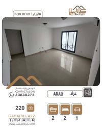 For rent: A distinguished apartment in Arad. A comfortable apartment with a smart design and excellent space utilization, located in a prime location near services. Apartment specifications: Two bedrooms (one is a master with wardrobes), two bathrooms, a spacious living room, a storage room. Area is approximately 90 square meters. Facilities and services: Parking space, elevator, close to all services. Rental price: 220 dinars. For contact and inquiries.