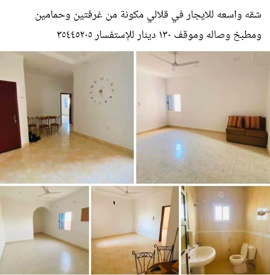 A spacious apartment for rent in Qalali, consisting of two bedrooms, two bathrooms, a kitchen, a living room, and a parking space for 130 dinars.