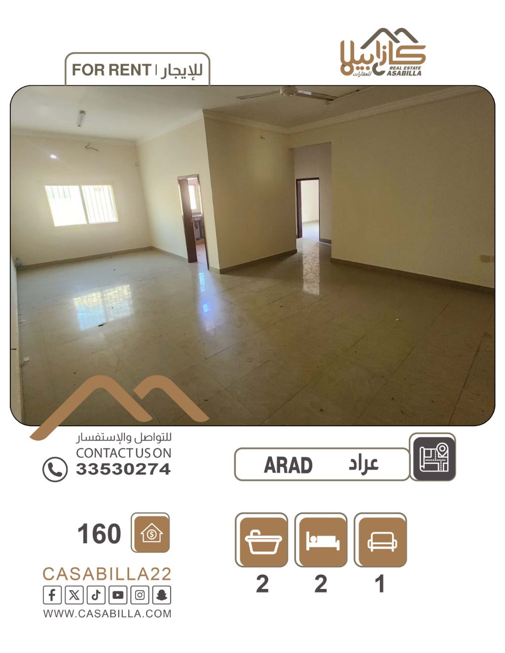 For rent: A comfortable apartment in Arad at a competitive price (160 dinars). A great opportunity for living in a quiet area suitable for families. The apartment features a practical design and excellent space, located in a vital area close to all essential services. Apartment specifications: Two bedrooms (one master), two bathrooms, a kitchen, and a spacious living room. Facilities and services: Parking available, elevator, close to all services, quiet area suitable for families. Rental price: 160 dinars. For contact and inquiries.