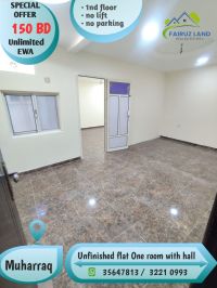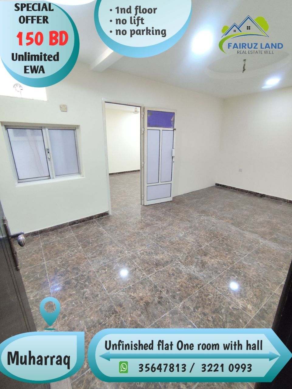 Location: Muharraq (Fareej Bin Hindi). A fully renovated spacious apartment (one bedroom and living room) for 150 dinars, including electricity and water without consumption limit. Features: bedroom, living room, kitchen, bathroom, laundry area. Ground floor, no elevator. Close to services. For contact.