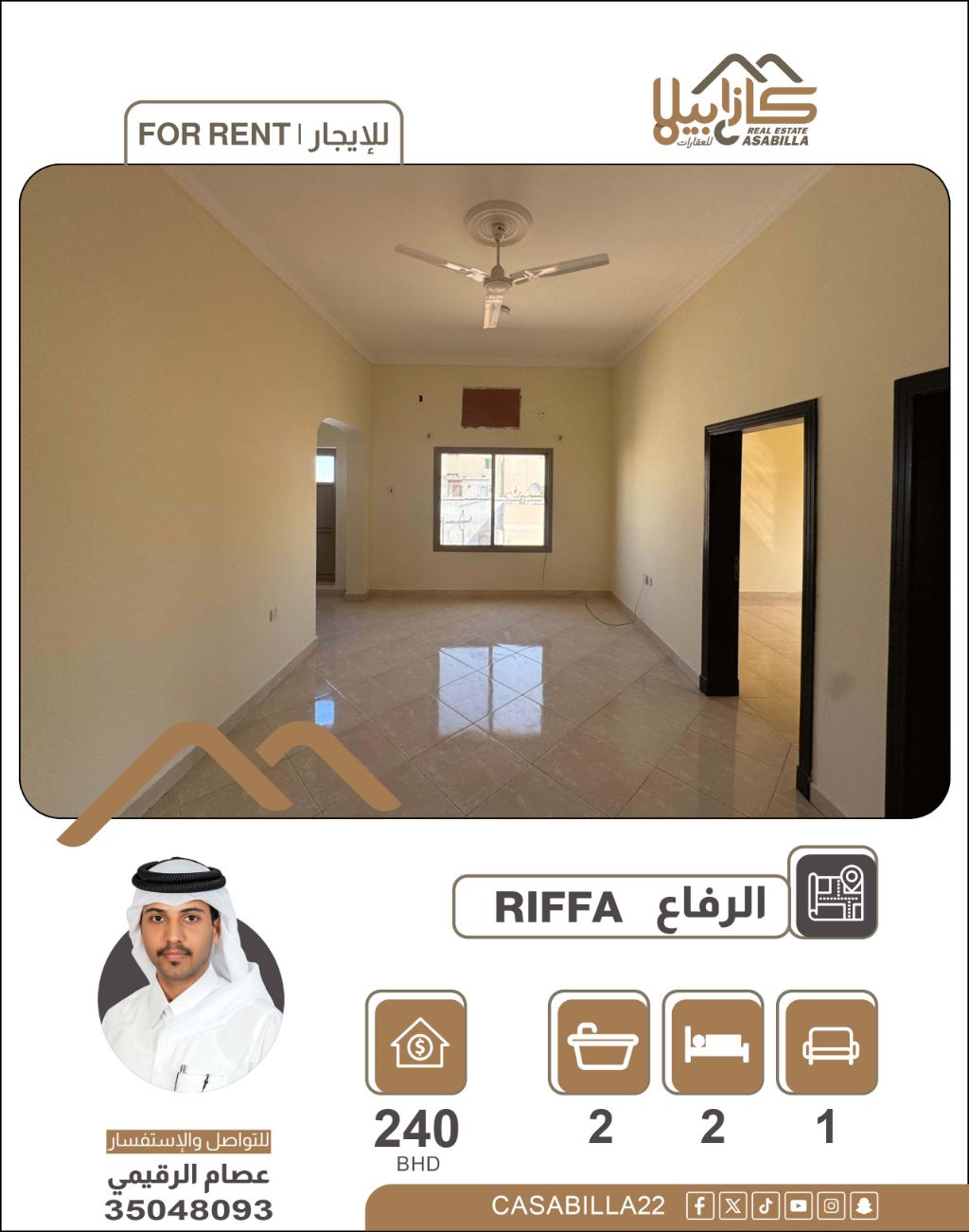 For rent An apartment in Riffa East - Abu Quwara. The apartment is located in a prime and very quiet location, suitable for families, and close to all essential services such as schools, markets, and restaurants, providing a comfortable and easy lifestyle. The apartment features a practical design and comfortable spaces with beautiful natural lighting, offering a quiet and suitable atmosphere for
