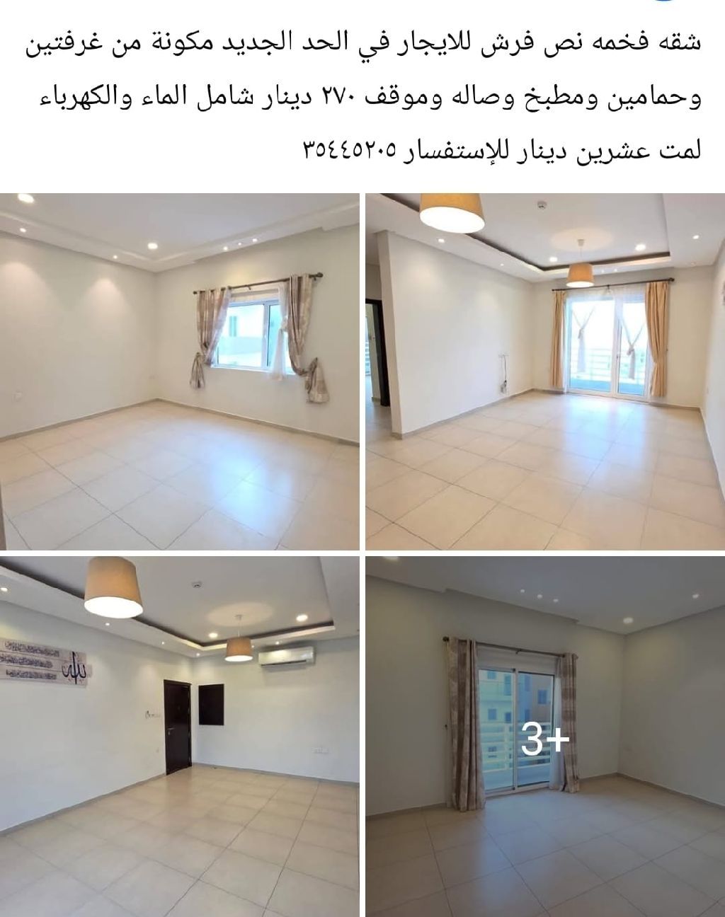 A luxurious semi-furnished apartment for rent in Al-Hadd Al-Jadeed, consisting of two bedrooms, two bathrooms, a kitchen, a living room, and a parking space. The rent is 270 dinars including water and electricity for twenty days. An unmissable opportunity.
