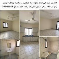For rent: An apartment in Al-Hadd consisting of two rooms, two bathrooms, a kitchen, a hallway, and a yard for 190 dinars, including electricity and water. For inquiries.
