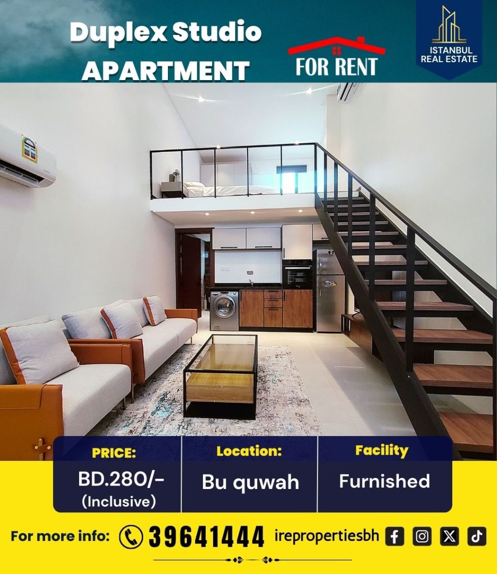 Fully furnished Duplex Studio Apartment for rent in Bu Quwah - BD280 inclusive. This fully furnished Studio Apartment is located in Bu Quwah near Capital School. It consists of a duplex bedroom, 1 bathroom, living and dining area, modern kitchen, 24-hour security, etc. Easy access to Janabiyah, Saar, Seef, Manama, Saudi Causeway, etc. Rent is BD280 inclusive, with EWA BD20 limit.