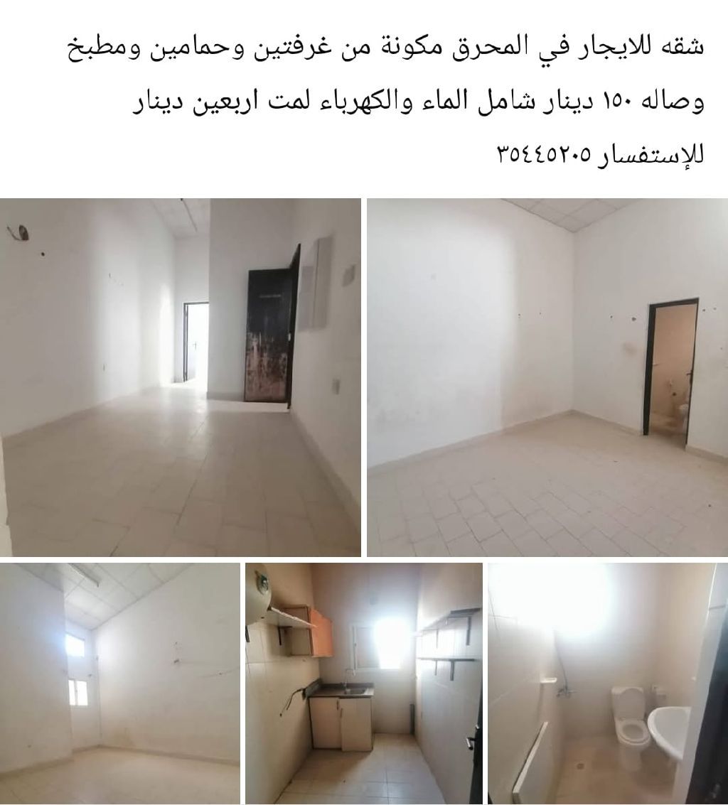 An apartment for rent in Muharraq consisting of two rooms, two bathrooms, a kitchen, and a hall for 150 dinars, including water and electricity for forty dinars.
