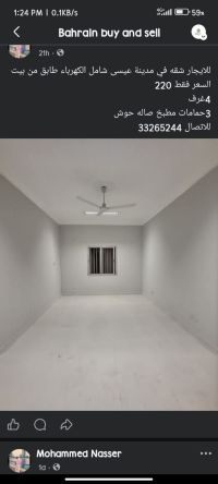 For rent, an apartment in Riffa Al-Bahri consisting of two bedrooms, two bathrooms, a living room, and a kitchen. Price only 180.