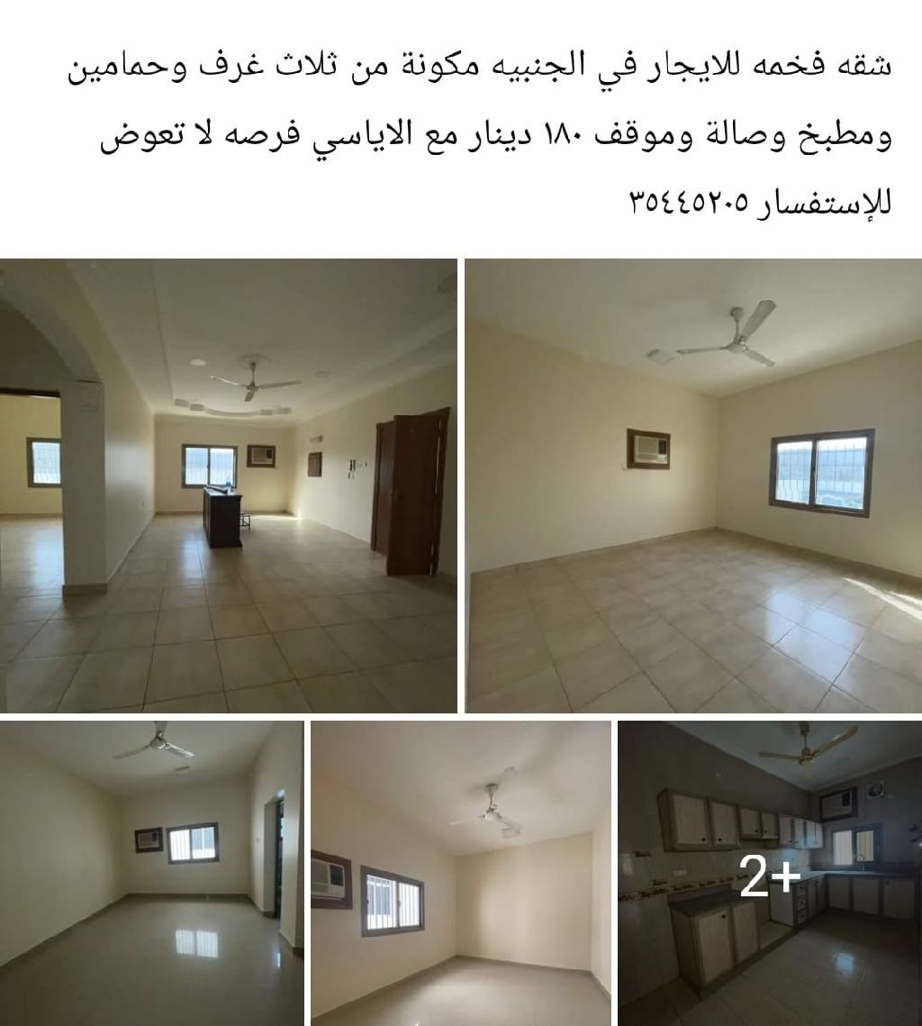 A luxurious apartment for rent in Janabiya, consisting of three rooms, two bathrooms, a kitchen, a hall, and a parking space for 180 dinars with air conditioners. An opportunity not to be missed.