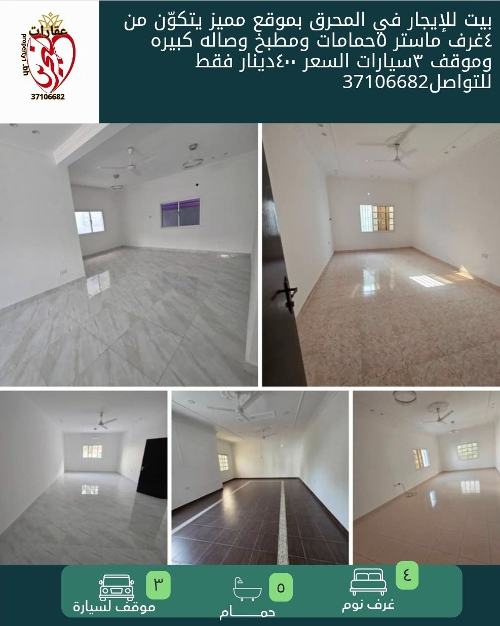 House for rent in Muharraq in a prime location, consisting of 4 master bedrooms, 5 bathrooms, a kitchen, a large living room, and parking for 3 cars. Price is only 400 dinars. For contact.