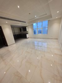 An apartment with air conditioning for rent in Al-Hidd, consisting of one bedroom, a living room, a kitchen, a bathroom, and a parking space, priced at 230 Bahraini dinars inclusive, with a limit of 30 dinars. There is a swimming pool and gym in the building.