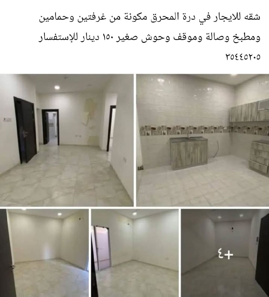 An apartment for rent in Durrat Al Muharraq, consisting of two bedrooms, two bathrooms, a kitchen, a living room, a parking space, and a small yard, priced at 150 dinars.
