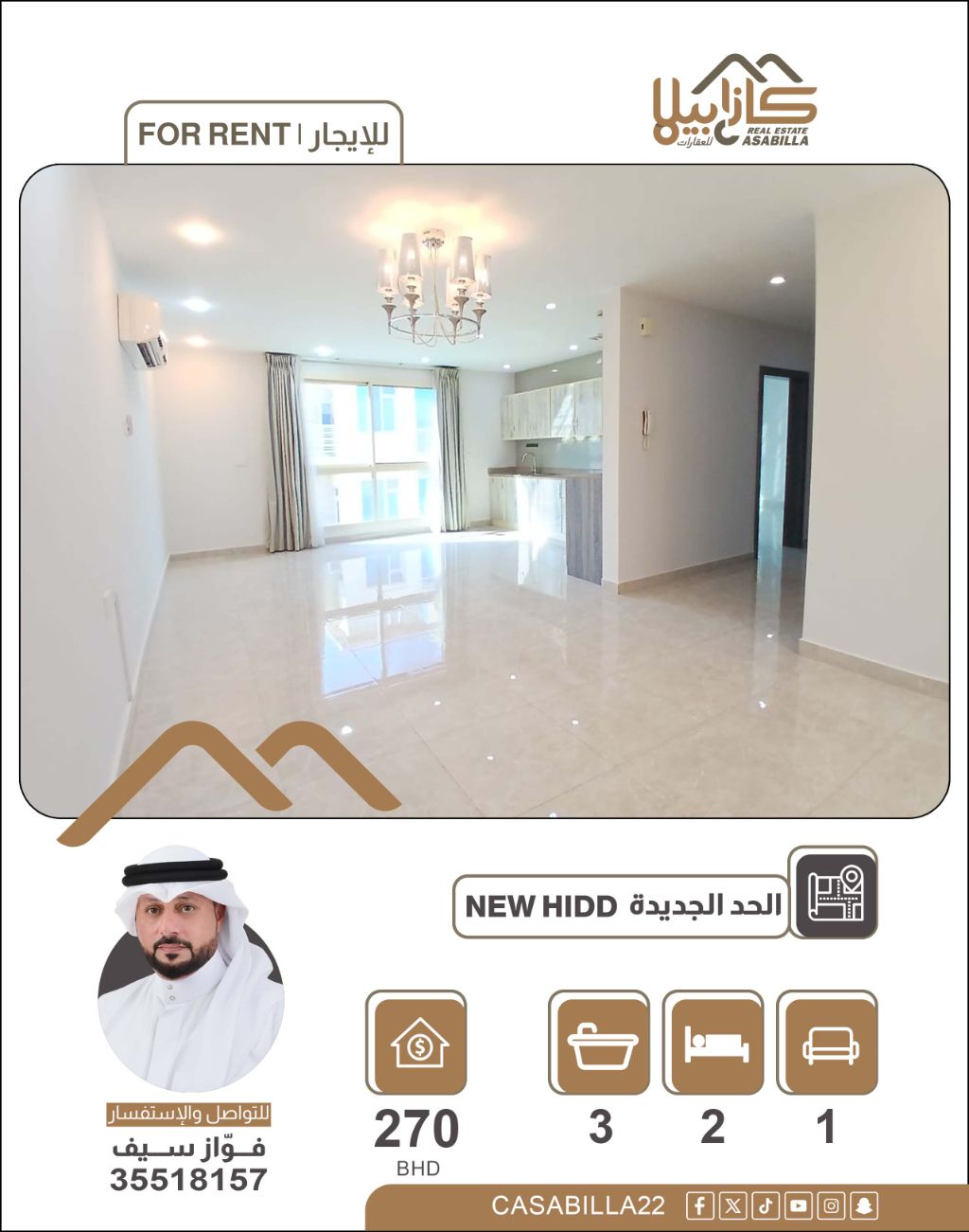 For rent: A luxurious apartment in the New Hidd area, consisting of two master bedrooms, a spacious living room, an open kitchen, three bathrooms, a balcony, with air conditioners. Price: 270 dinars, including electricity with a consumption limit of 20 dinars. For inquiries.