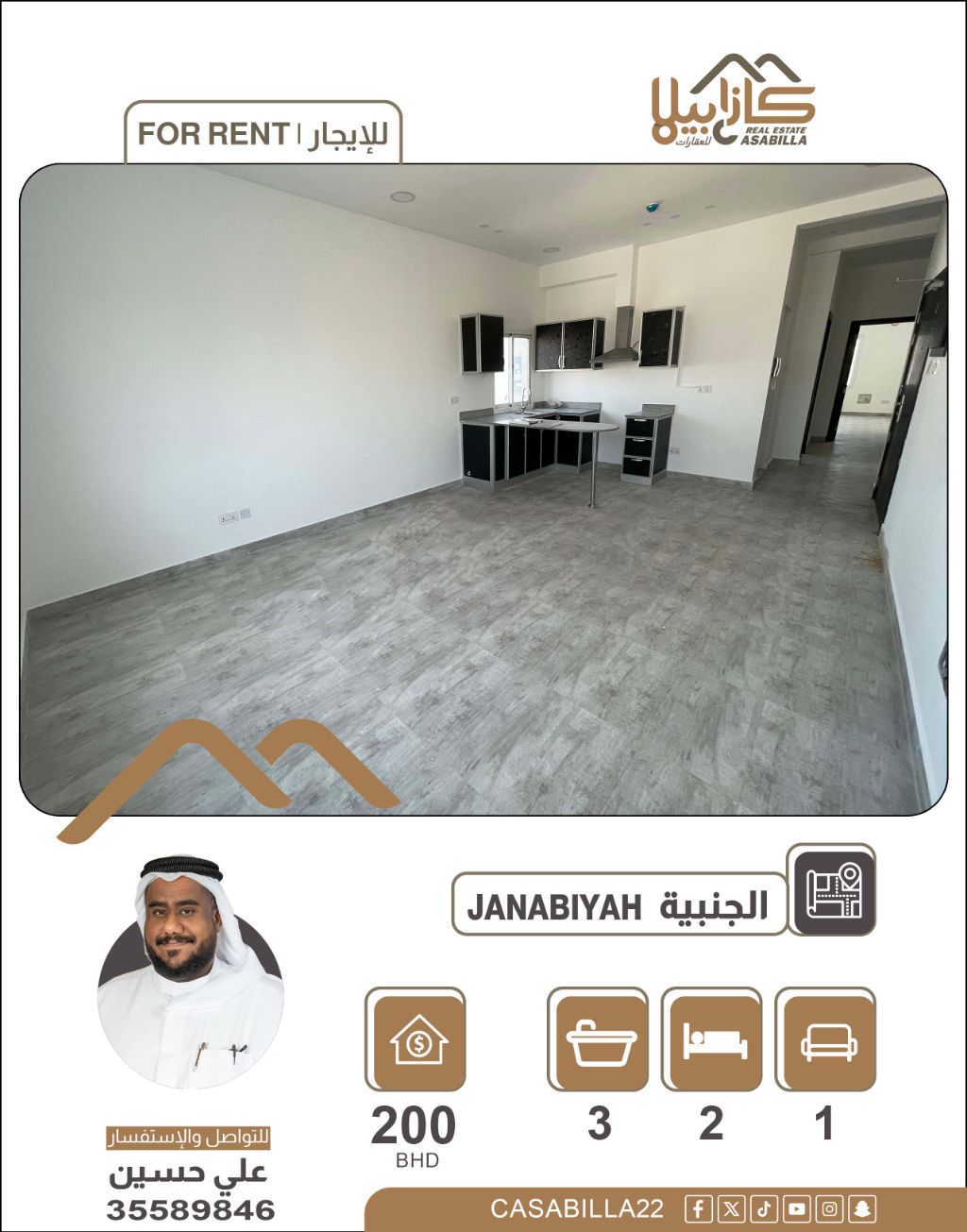 A luxurious apartment for rent in Janabiya, a quiet location with an excellent price. Enjoy living in the upscale Janabiya area. A modern apartment with a practical and comfortable design, providing you with the perfect space and proximity to all essential services and shopping malls. It consists of two bedrooms, a spacious living room, an open kitchen with a modern design, and three bathrooms. Location: Janabiya. Rent: 200 dinars only. A practical and suitable apartment for families, with a comfortable design, quiet location, and close to services. For contact and inquiries, please call.