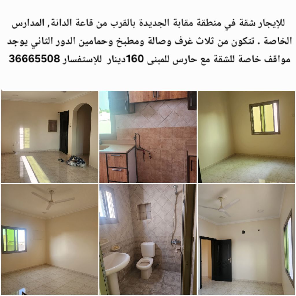 For rent: An apartment in the new Muqaba area near Dana Hall, private schools, and many services. It consists of three rooms, a hall, a kitchen, and two bathrooms on the second floor. There are private parking spots for the apartment with a building guard. 160 dinars. For inquiries.