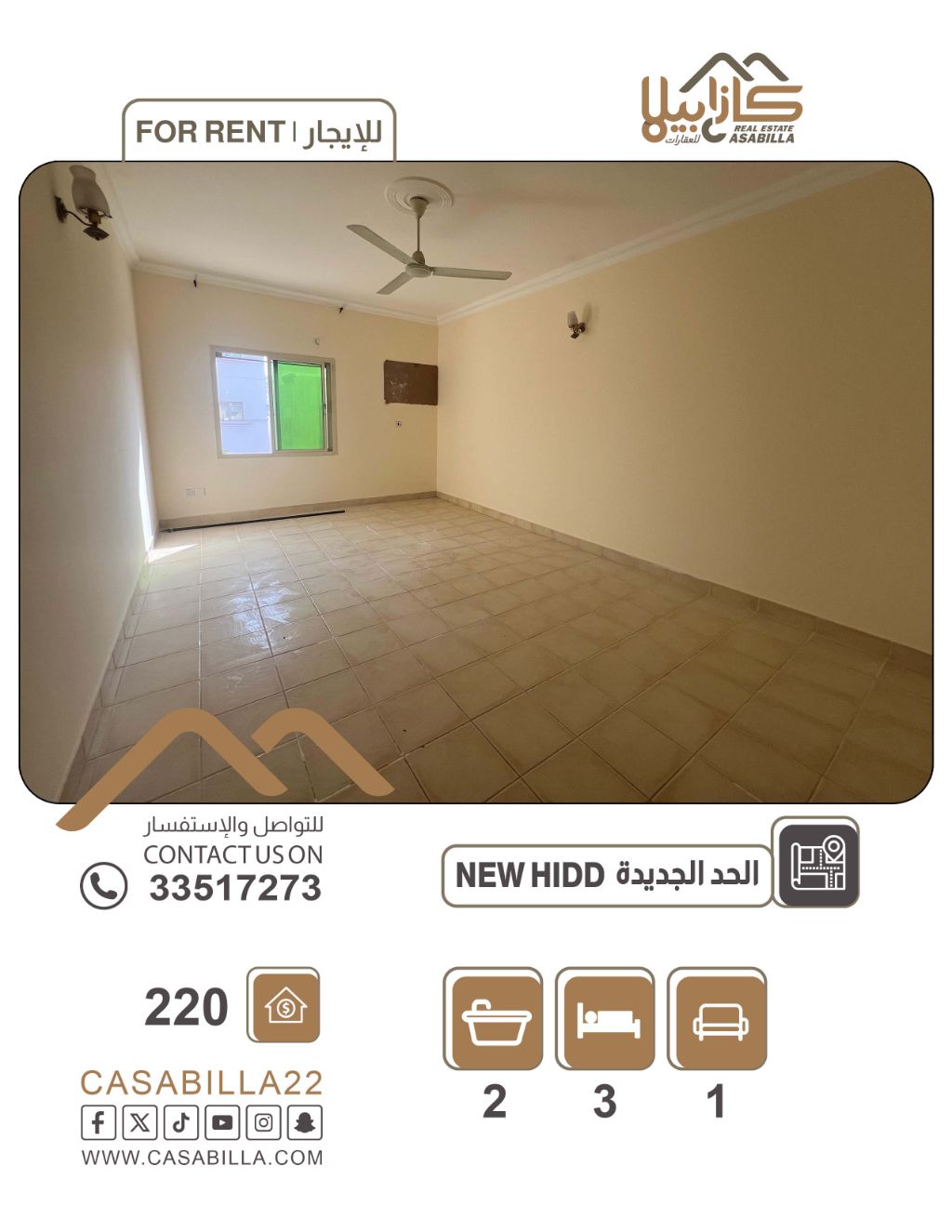 For rent: An apartment in the Al-Hadd New Area. Apartment details: 3 rooms (1 master), 2 bathrooms, kitchen, living room. Facilities and services: Prime location, close to services, shaded parking. Rental price: 220 dinars, excluding electricity and water. For contact.