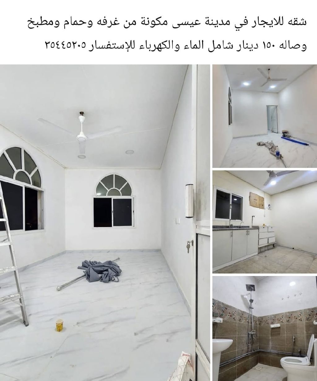 An apartment for rent in Isa Town, consisting of one bedroom, a kitchen, a bathroom, and a living room, at a price of 150 Bahraini dinars, including water and electricity.