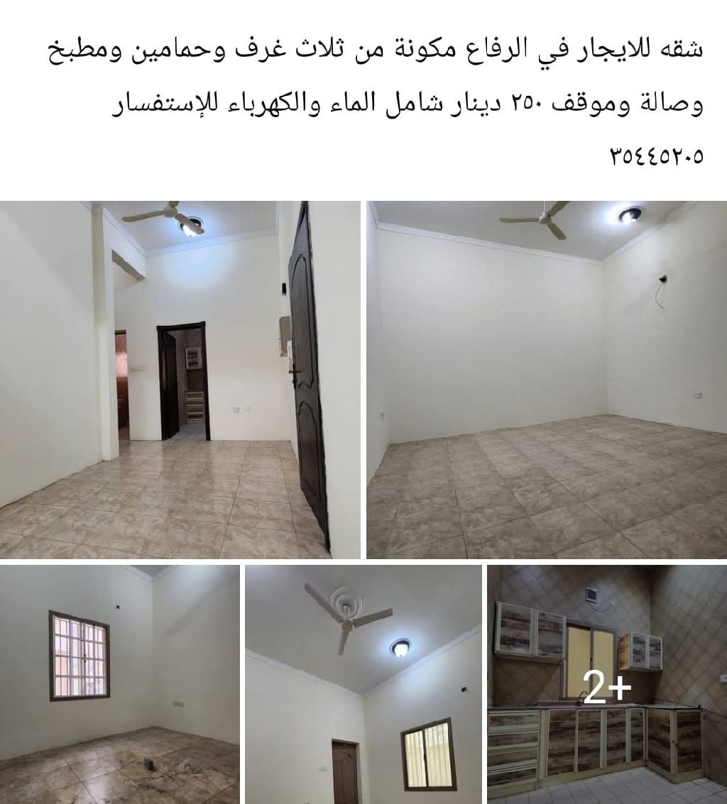 An apartment for rent in Riffa consisting of three rooms, two bathrooms, a kitchen, a living room, and a parking space for 250 dinars, including water and electricity.