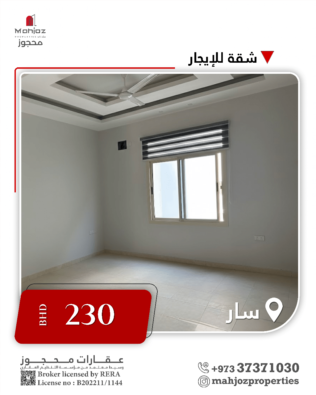 Mahjuz Real Estate offers an apartment for rent in Sar. The location is Sar. It contains 3 bedrooms, 3 bathrooms, a spacious living room, a kitchen, an elevator, security cameras, and a parking space (for families only). The rent is 230 Bahraini Dinars per month. Contact us for more details.
