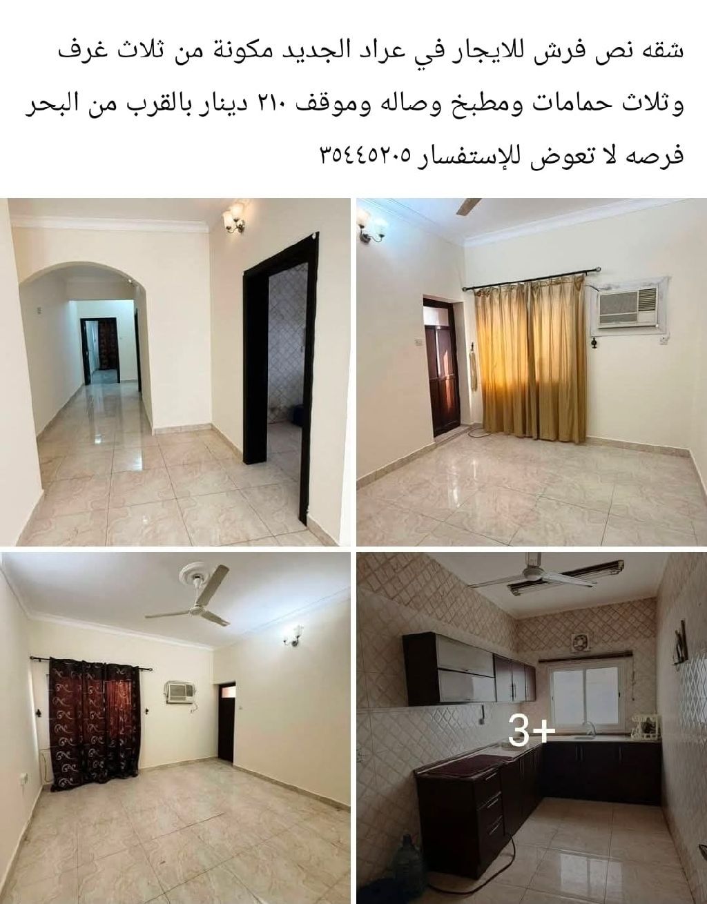 A semi-furnished apartment for rent in New Arad, consisting of three bedrooms, three bathrooms, a kitchen, a living room, and a parking space, priced at 210 dinars negotiable, near the sea. An unmissable opportunity.