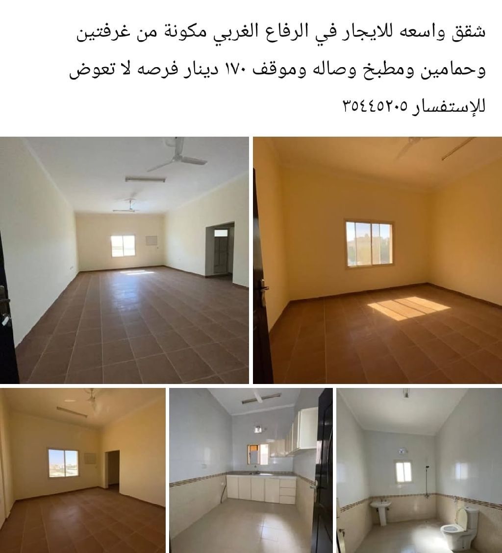 A spacious apartment for rent in West Riffa, consisting of two bedrooms, two bathrooms, a kitchen, a living room, and a parking space for 170 dinars.