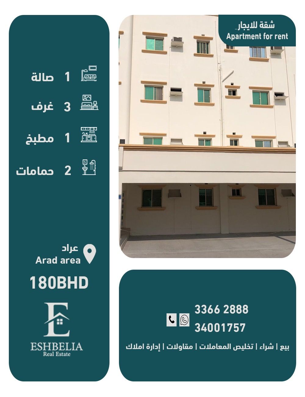 We have a building consisting of (13) apartments for rent in the Arad area, close to services, a quiet and clean area. The apartment consists of 3 - spacious bedrooms, including a master bedroom, 2 - bathrooms, 1 - kitchen, 1 - living room. The requested price is (180) dinars, negotiable. It includes an elevator, 24-hour security guard, surveillance cameras. License number B201804 / 0125. For contact, Seville Office, Bouabdullah. Ad number (92).