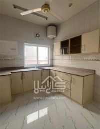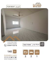 For rent: An apartment in Isa Town, Al-Abayyat Street, suitable for family living. First, apartment details: two bedrooms, two bathrooms, a living room, a kitchen, and a large balcony. Second, facilities and services: close to services, shaded parking. Rent: 140 dinars, excluding electricity and water. For contact.