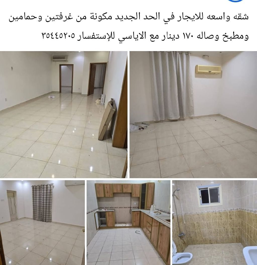 A spacious apartment for rent in Al-Hadd Al-Jadeed, consisting of two bedrooms, two bathrooms, a kitchen, and a living room, priced at 170 dinars with air conditioners. An opportunity not to be missed.