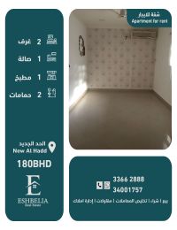 We have an apartment for rent with air conditioners in the new Al-Hadd area, close to services, near Al-Aseel brand. The apartment consists of 2 bedrooms, 2 bathrooms, 1 living room, and 1 kitchen. Note: There is parking and an elevator in the building. The rental price is 180 dinars. License number B201804/0125. Contact the Seville office, Bouabdallah. Ad number (132).