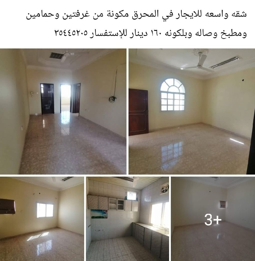 A spacious apartment for rent in Muharraq, consisting of two bedrooms, two bathrooms, a kitchen, a living room, and a balcony, for 160 dinars.