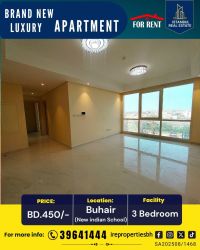 A brand new apartment consisting of 3 bedrooms and a living room for rent in the Buheir area near the New India School, priced at 450 Bahraini Dinars. This family apartment with 3 bedrooms is located in the Buheir area near the New India School, and consists of 3 bedrooms, 3 bathrooms, a spacious living and dining area, a closed kitchen, covered parking, a gym, a children's play area, a party hall, a meeting hall, 24-hour security, and more.