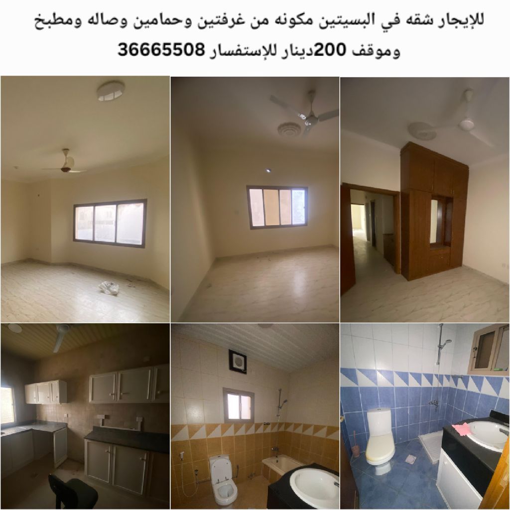 For rent, an apartment in Al-Busaiteen consisting of two bedrooms, two bathrooms, a living room, a kitchen, and a parking space for 200 dinars.