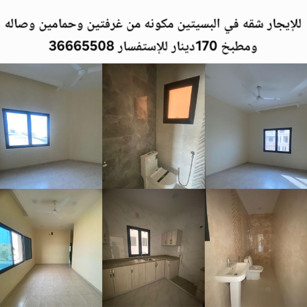 For rent, an apartment in Al-Busaiteen consisting of two bedrooms, two bathrooms, a living room, and a kitchen for 170 dinars.