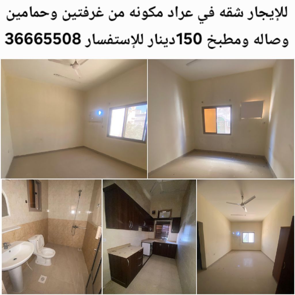 For rent, an apartment in Arad consisting of two bedrooms, two bathrooms, a living room, and a kitchen for 150 dinars.
