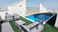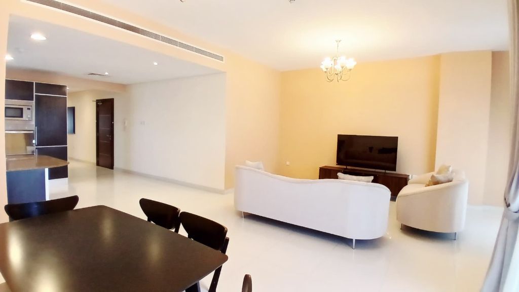 Fully furnished apartment for rent (2 bedrooms for BD 380, inclusive of EWA) in Mahooz. The apartment features two bright bedrooms with a sea view, two bathrooms, a moderate living area, a fully fitted kitchen, and a balcony in the living area for a breathtaking view. Centralized AC, gym, swimming pool, barbecue area on the roof, 24/7 reception and security, and excellent round-the-clock service. Furnished details in the living area.