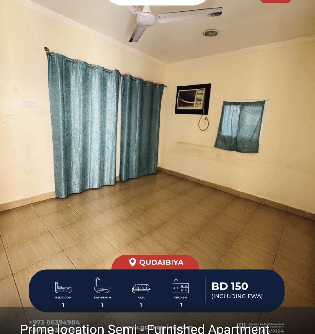A semi-furnished apartment for rent in a prime location in Al Qudaibiya. Apartment details: one bedroom, one bathroom, a hall, and a kitchen. Monthly rent is 145 Bahraini dinars, including electricity. For contact.