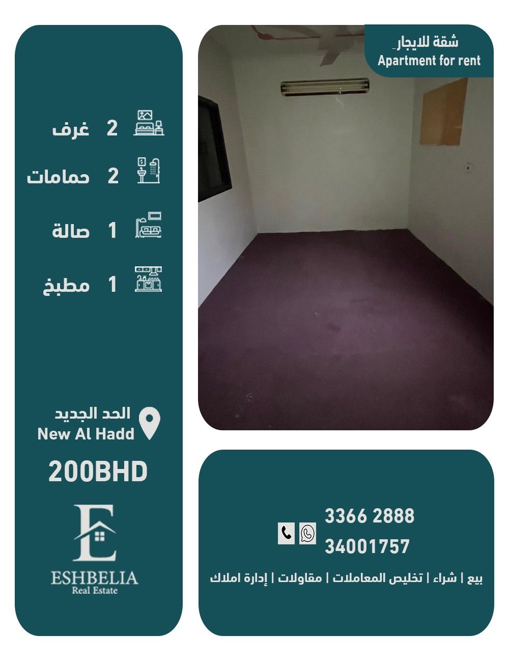We have an apartment for rent in Al-Hadd Al-Qadeem, close to services. The apartment consists of 3 bedrooms, 3 bathrooms, 1 very large living room, and 1 kitchen. The rental price is 200 Bahraini dinars. License number: B201804/0125. Contact the Ishbiliya office of Bouabdallah. Ad number: 144.