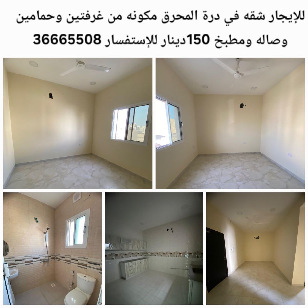 For rent, an apartment in Durrat Al Muharraq consisting of two bedrooms, two bathrooms, a living room, and a kitchen for 150 dinars.