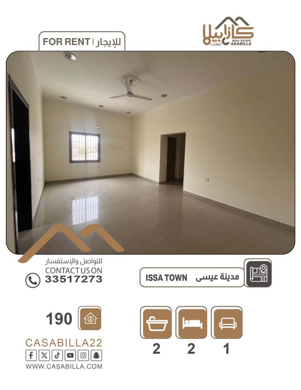 For rent: An apartment in Isa Town, close to Discovery Roundabout. First, apartment details: 2 bedrooms (one master), 2 bathrooms, 1 family living room, 1 kitchen, shaded parking, elevator. Second, facilities and services: close to services and a main street. Rent: 190 BHD, excluding electricity and water. For more information, please contact.