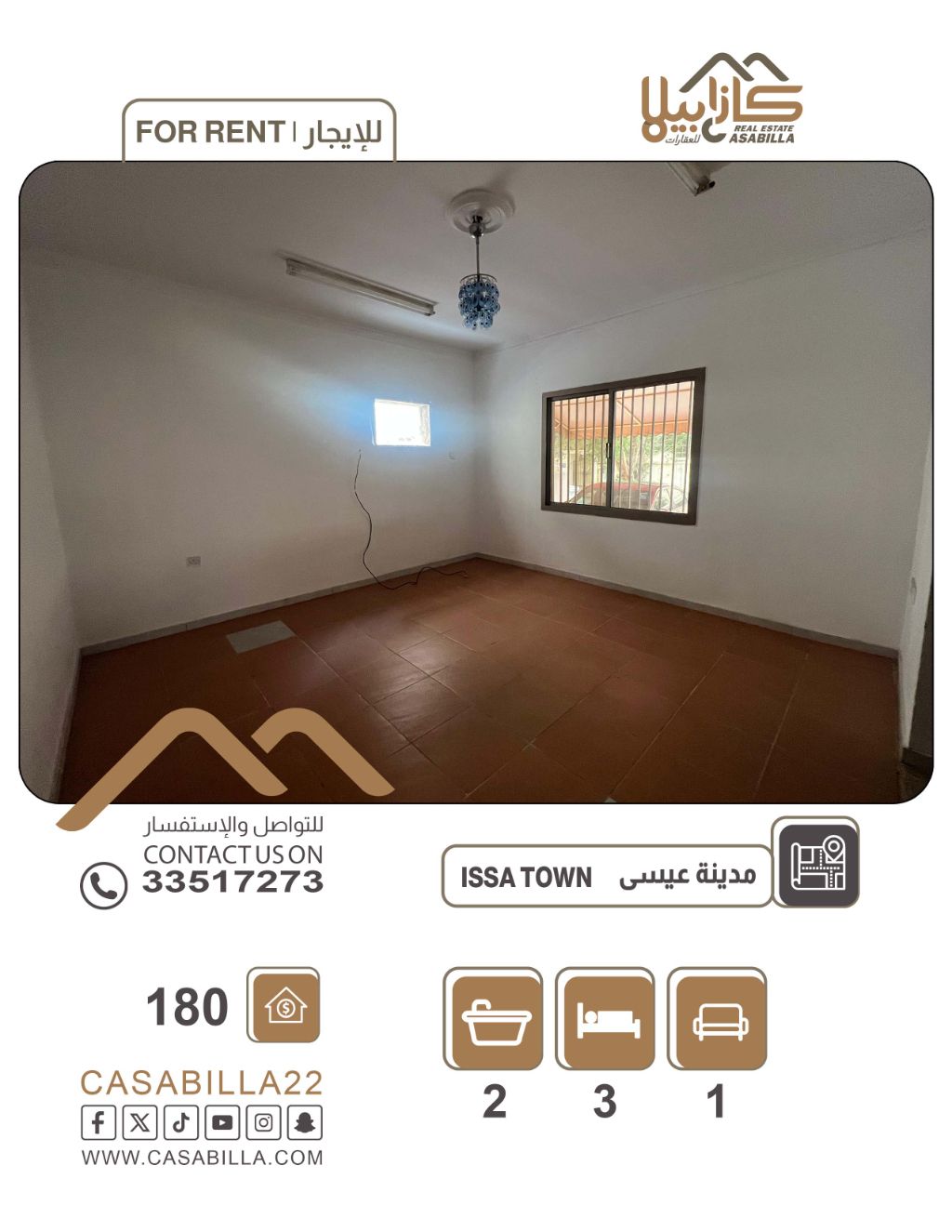 For rent: An apartment in Isa Town, behind Al-Farooq Kindergarten. It has 3 bedrooms, one of which is a master bedroom, a living room, two bathrooms, and a shaded parking space. The area is quiet and close to services, commercial complexes, restaurants, and schools. Rent is 180 BHD, excluding water and electricity. For contact.