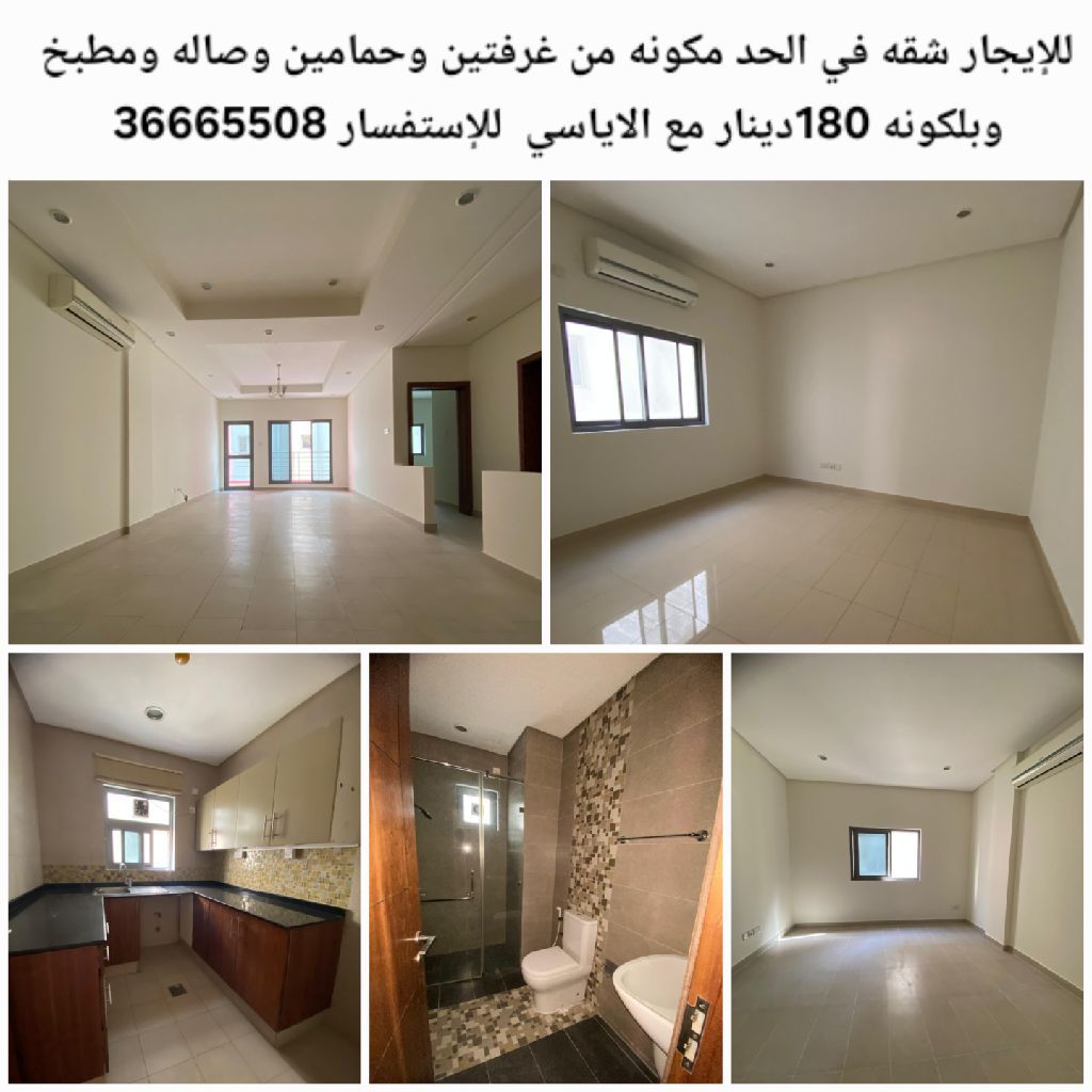 For rent, an apartment in Al-Hadd consisting of two rooms, two bathrooms, a hall, a kitchen, and a balcony for 180 dinars with air conditioning.