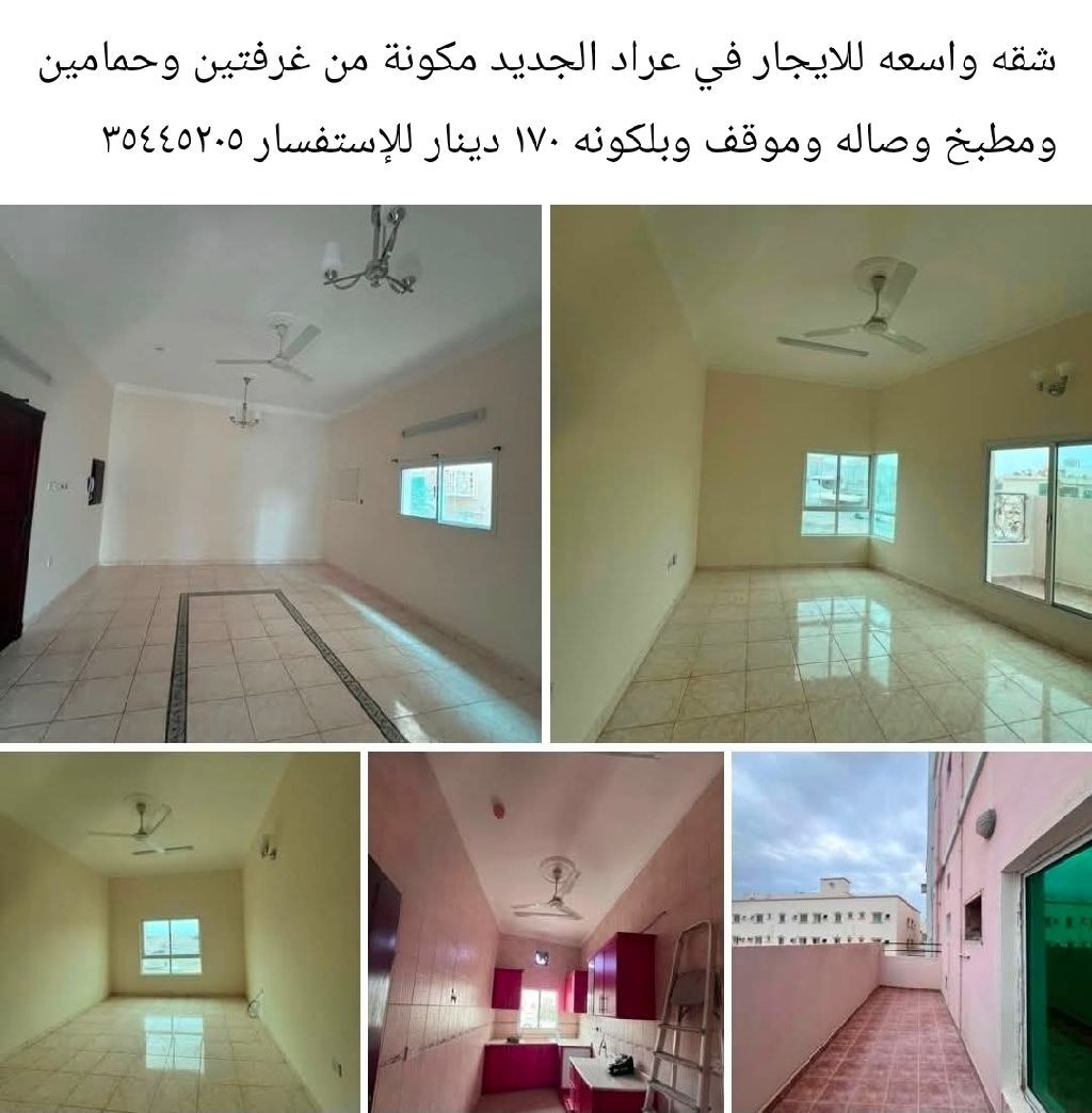 A spacious apartment for rent in New Arad, consisting of two bedrooms, two bathrooms, a kitchen, a living room, a parking space, and a balcony, for 170 dinars. An opportunity not to be missed.