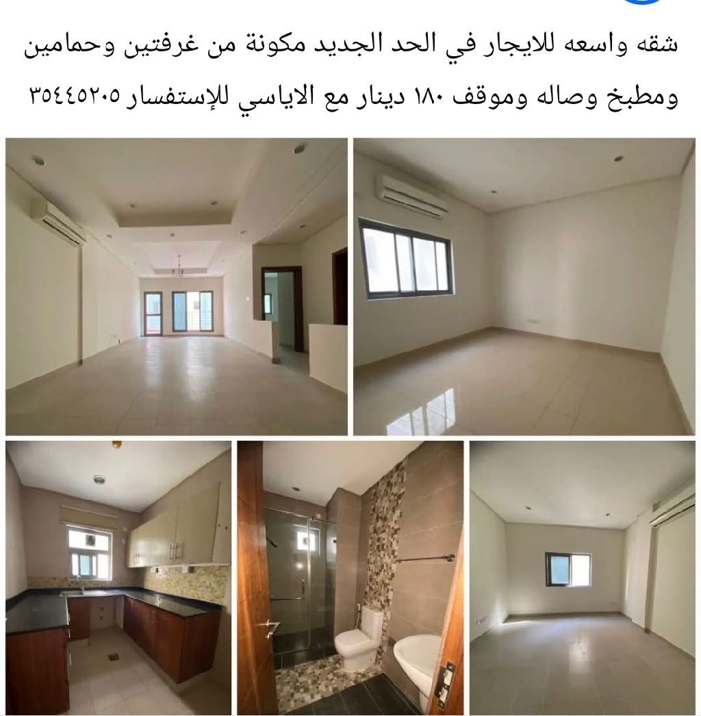 An apartment for rent in Al-Hadd Al-Jadeed, consisting of two bedrooms, two bathrooms, a kitchen, a living room, and a parking space for 180 dinars with air conditioners. An opportunity not to be missed.