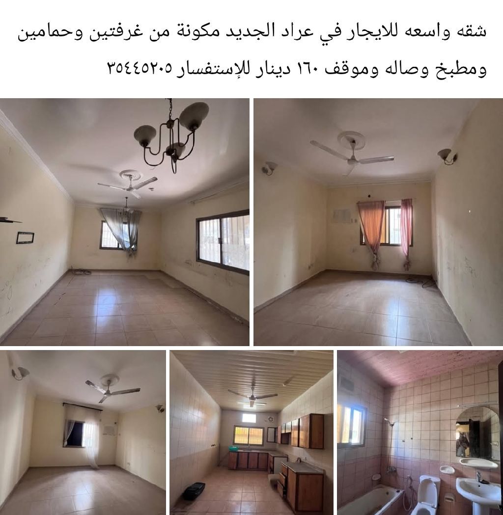 An apartment for rent in New Arad, consisting of two bedrooms, two bathrooms, a kitchen, a living room, and a parking space for 160 dinars.