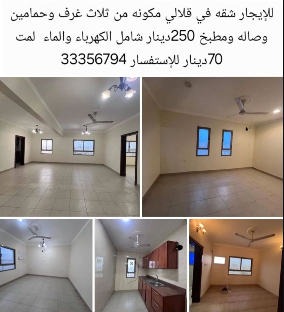 For rent, an apartment in Qalali consisting of three rooms, two bathrooms, a hall, and a kitchen for 250 dinars, including electricity and water, with a deposit of 70 dinars.