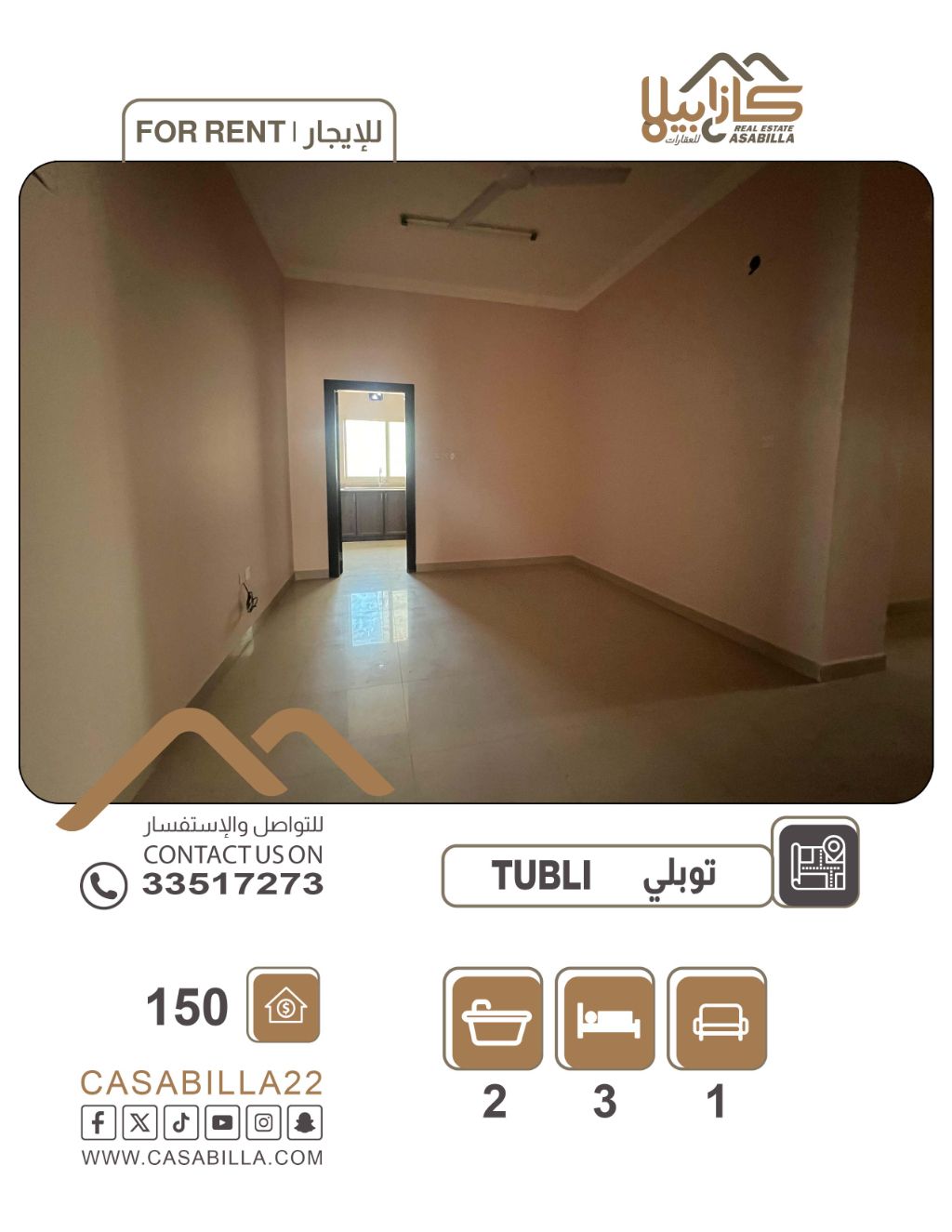 For rent: An apartment in Isa Town, Tubli, on Al-Khadamat Street, suitable for family living in a quiet neighborhood, in a luxurious building. First, apartment details: 3 bedrooms, one master bedroom, two bathrooms, a living room, and a kitchen. Shaded parking. Very close to the sea. Second, facilities and services: Close to services and the sea. Rent: 150 BHD, excluding electricity and water. For contact.