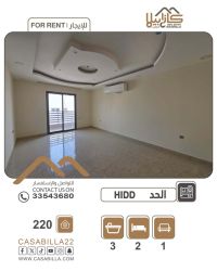 For rent: An apartment in a prime location in Al-Hidd with air conditioners and curtains. First, apartment details: 2 master bedrooms, 3 bathrooms, a living room with a bathroom, a kitchen, and a balcony. Second, facilities and services: elevator, building guard, shaded parking, near services. Rental price: 220 dinars without electricity. For contact.