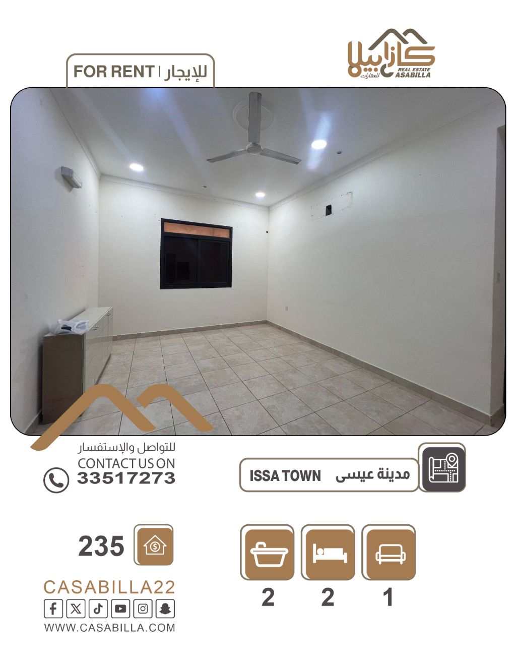 For rent: An apartment in Isa Town, close to Toyota agency, suitable for family living. First, apartment details: Two bedrooms (one master), two bathrooms, a living room, and a kitchen. There is an elevator. Second, facilities and services: Close to services, includes shaded parking. Rent is 235 dinars, including electricity and water. For contact.