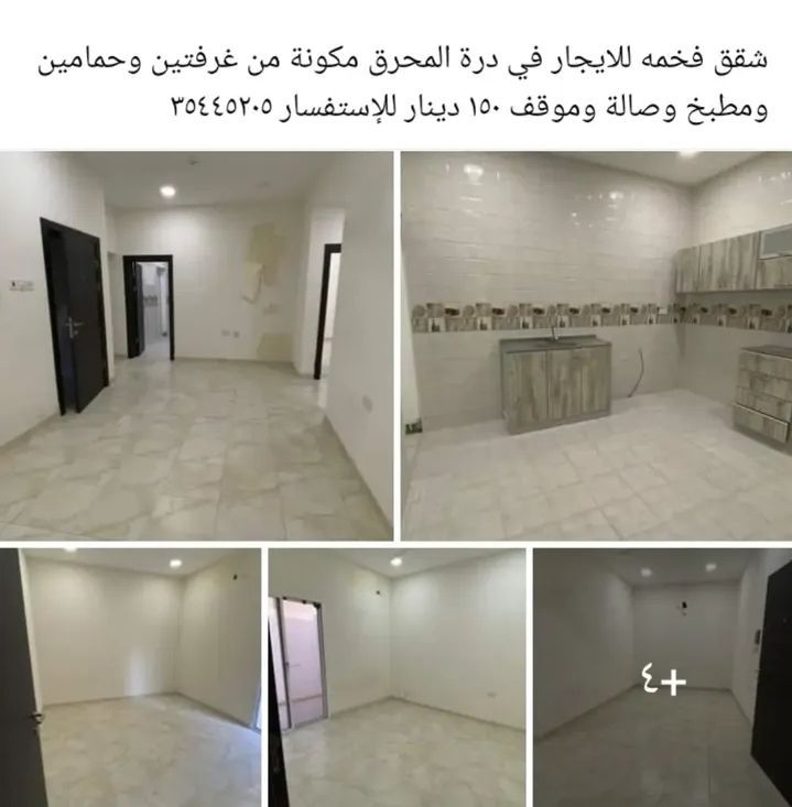 A luxurious apartment for rent in Durrat Al Muharraq, consisting of two bedrooms, two bathrooms, a kitchen, a living room, and a parking space for 150 dinars. An opportunity not to be missed.